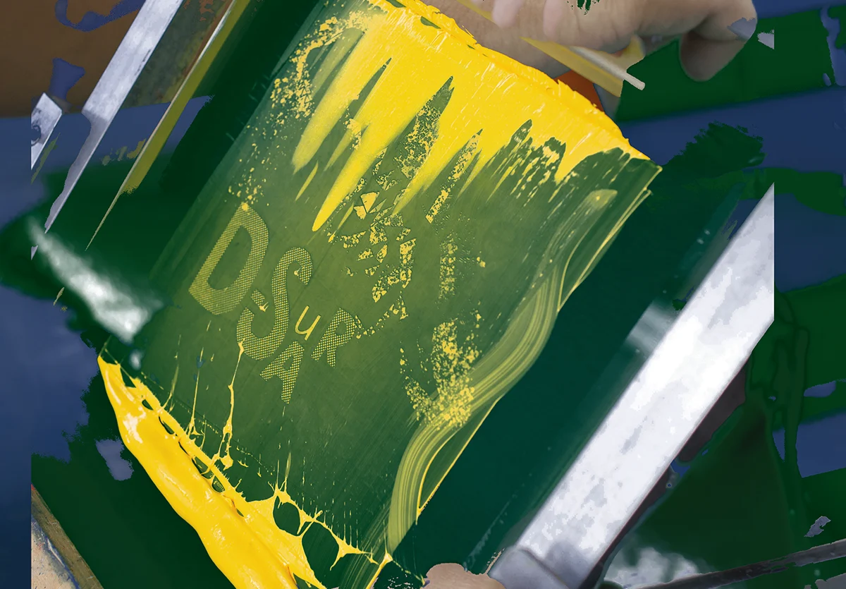 Screen printing is a printing technique that originated in China over 2000 years ago. It uses a mesh of nylon fabric (originally silk) stretched on a frame. The image is created by blocking out the areas that should not receive ink. With the help of a squeegee, the paint is pressed through the mesh, passing only through the open areas. The process is repeated for each color used. Screen printing is the ideal technique for flat compositions, creating a dense, subtle and silky impression.